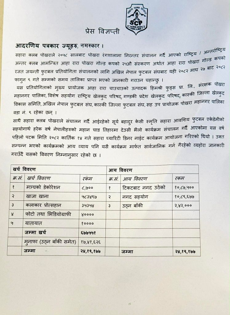 सूर्यबहादुर केसी स्मृति सहारा आवासीय फुटबल एकेडेमी सहयोगार्थ सहारा क्लब पोखराले आयोजना गरेको सहारा च्यारिटी डिनर नाइट–२०८२ को आयव्यय सार्वजनिक गरिएको छ ।