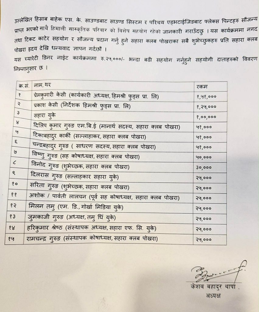 क्लबले २५ हजारभन्दा बढी सहयोग गर्ने दाताको नामसमेत सार्वजनिक गरेको छ । तीमध्ये हिमश्री फुड्स प्रालिका कार्यकारी अध्यक्ष प्रेमकुमारी केसीबाट १ लाख ५१ हजार, निर्देशक प्रकाश केसीबाट १ लाख २५ हजार, सहारा युकेबाट १ लाख सहयोग प्राप्त भएको छ ।